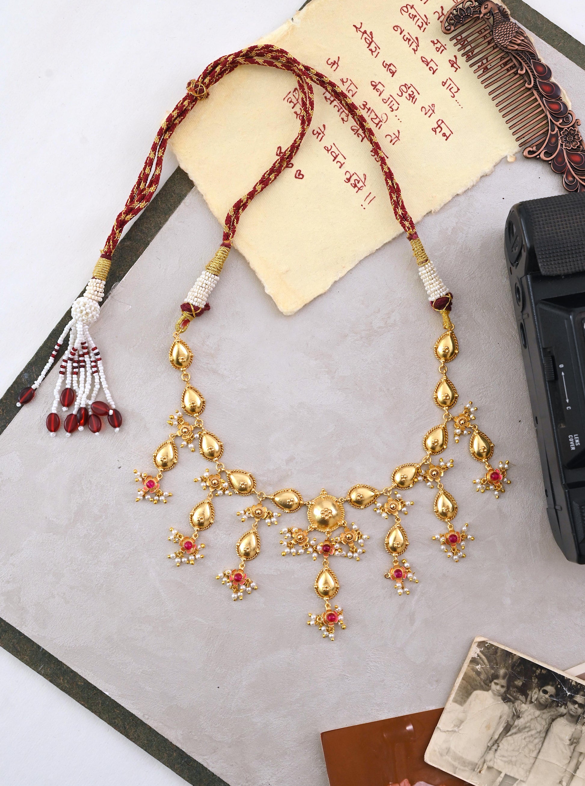 - An exquisite Begum Haar featuring red jade stones studded flowers, beautifully complimented with delicate white pearls. This regal piece blends opulence with tradition, making it a perfect choice for weddings, festive wear, and grand celebrations.
