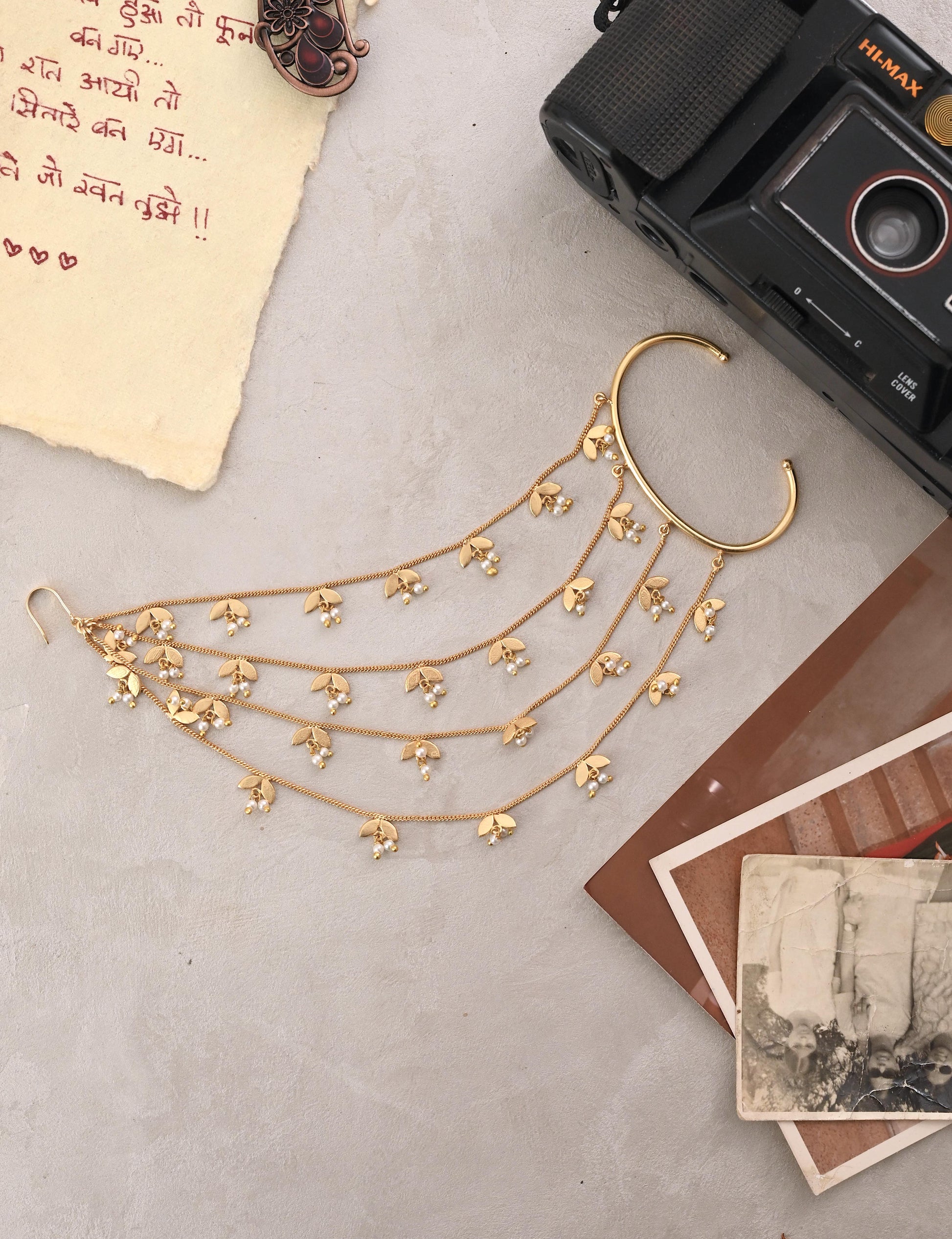 - Elegant gold plated Kaanchain featuring four cascading chains with delicate leaf motifs and lustrous white pearls. A regal accessory for traditional grandeur.