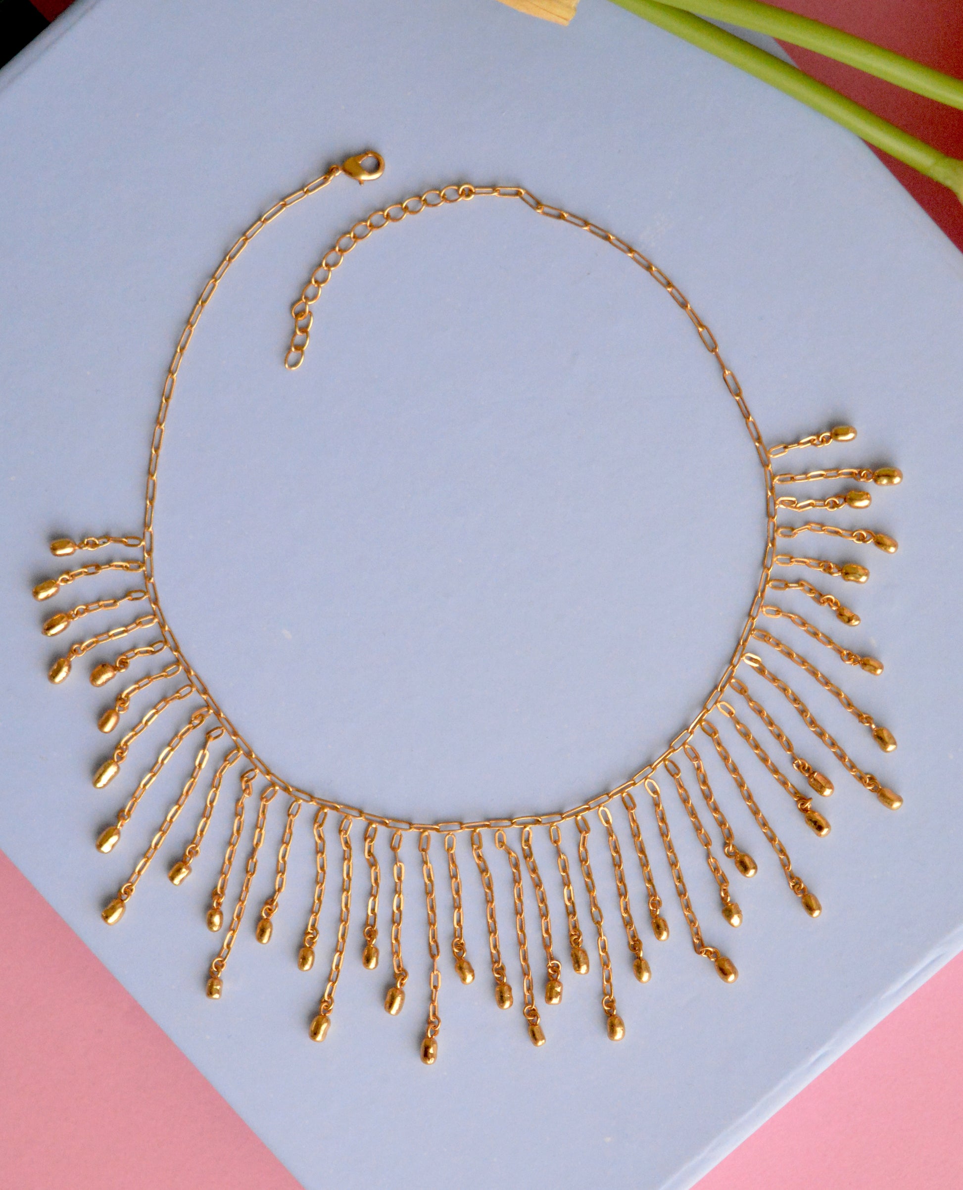 - A delicate chain with beautifully golden drops of mung beans creating an elegant and statement piece.