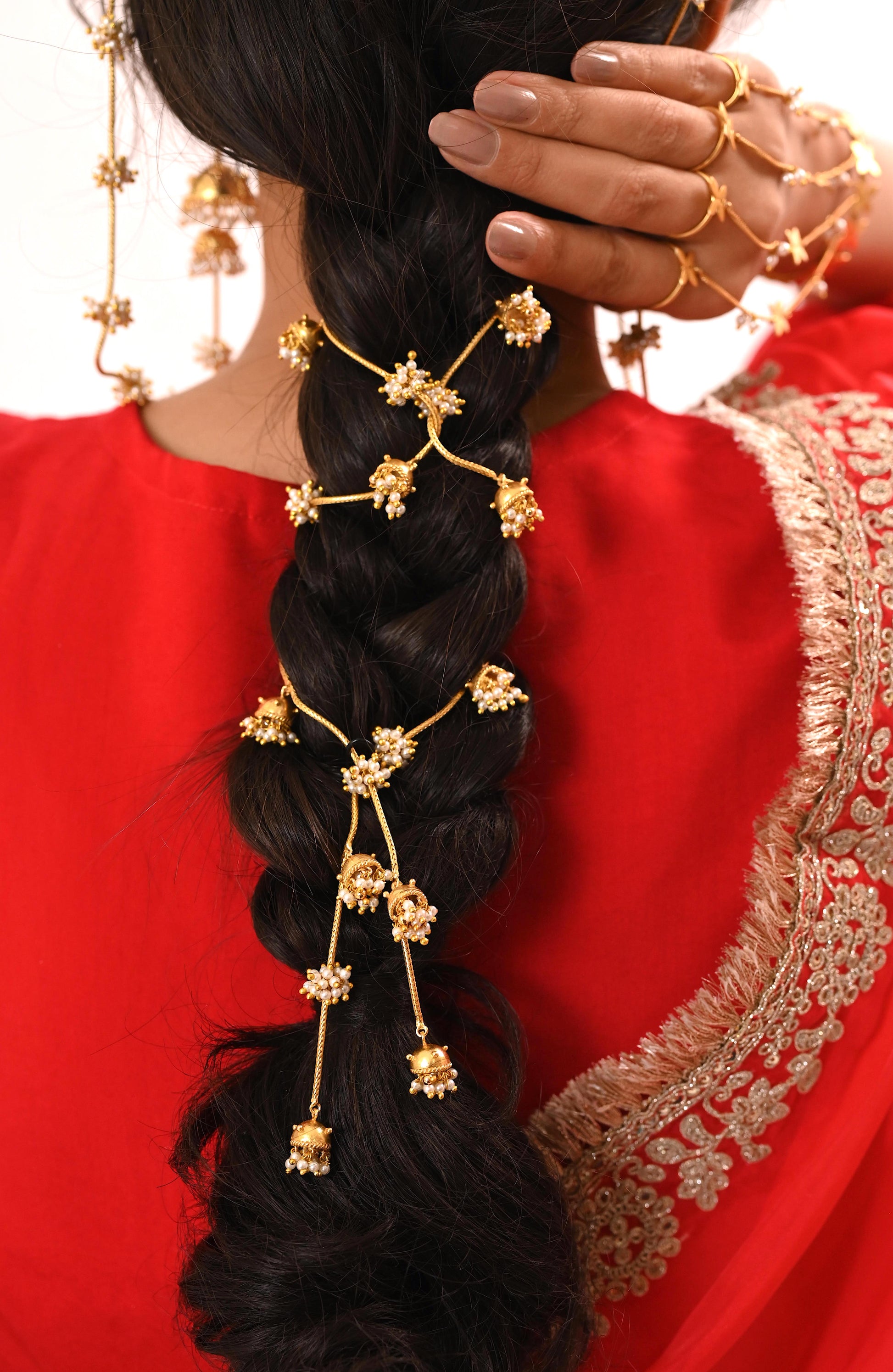 - A stunning Neerja hairchain crafted with gold plated jhumkas, beautifully accented by delicate white pearl drops. This elegant piece adds a regal charm