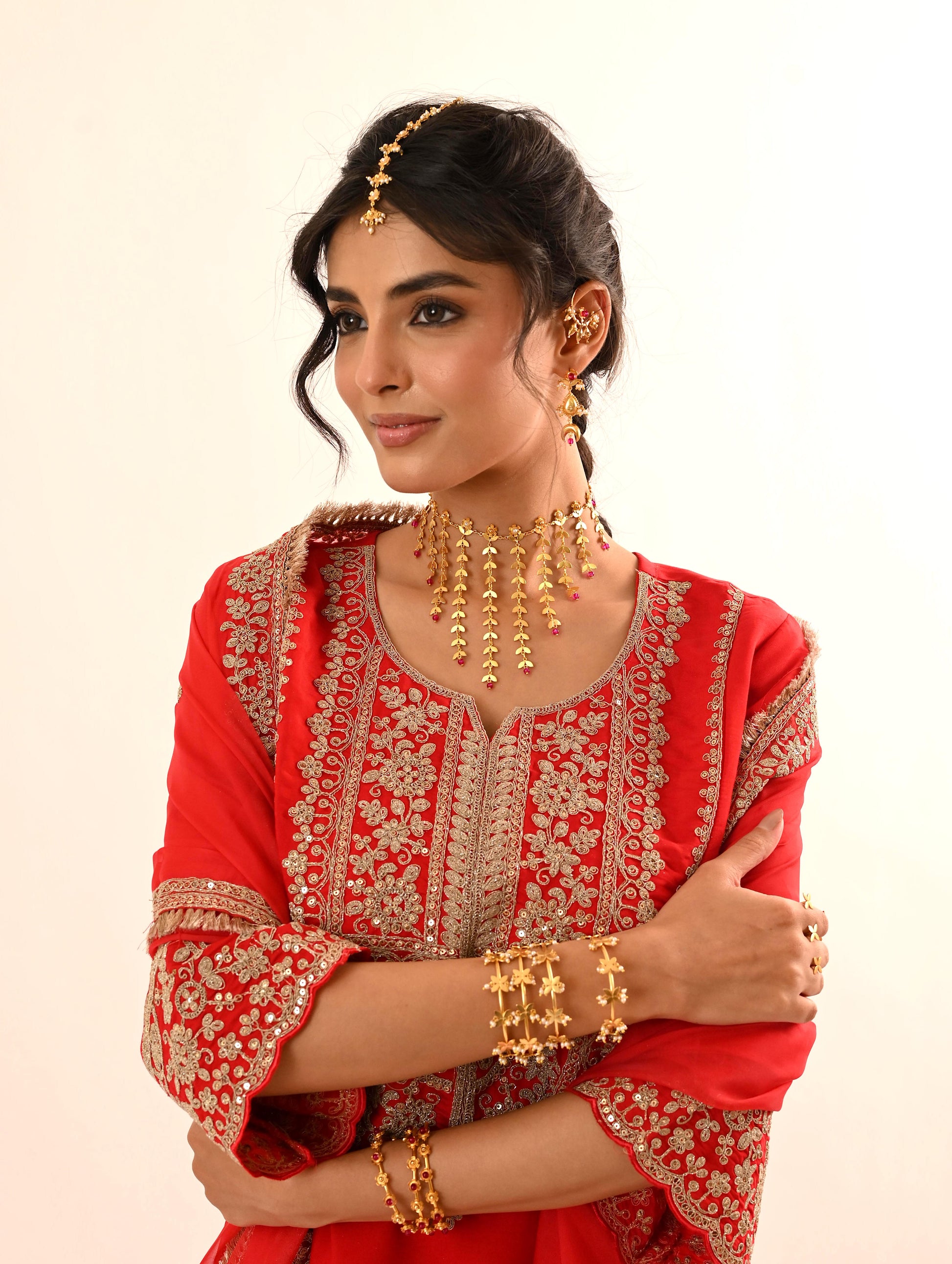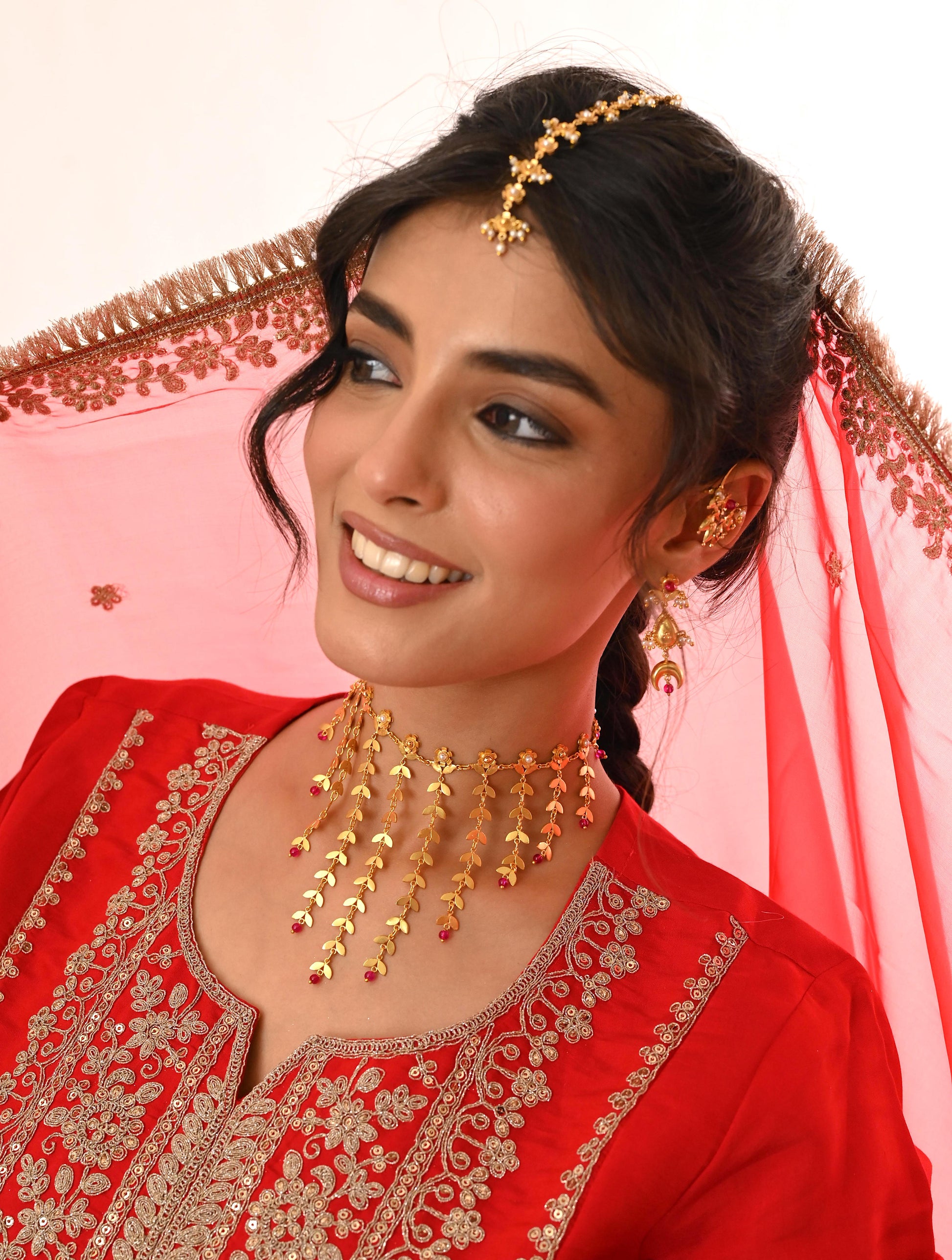 - An exquisite haar designed with multiple chains, each ending in delicate petals adorned with red jade stones. A perfect blend of elegance and tradition, this statement piece is ideal for weddings and festive occasions.